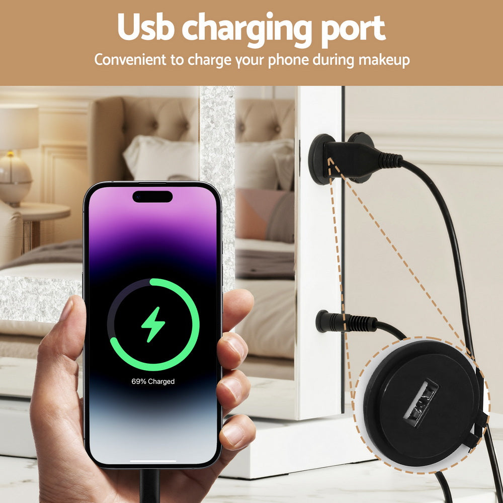 Get the star treatment you deserve with a gorgeous lighted Makeup Mirror from Embellir. Framed by LED light strips, the mirror lights up your visage to accurately complete your makeup routine. The frame is sturdy and lightweight, adding a touch of glamour to the entire mirror. The frame sits on an equally smooth powder-coated MDF base for stability and durability. The base is detachable, so you can choose to wall mount your mirror and save space. The light is easily adjustable using the mirror touch controls. Adjust for brightness and colour temperature including warm light, natural light and cool light. A built-in Bluetooth speaker allows you to listen to your favourite audiobooks, music and podcasts as you go, and the USB charging port can help keep your devices charged at all times. Turn your bedroom into a celebrity dressing room overnight with the Embellir Makeup Mirror.