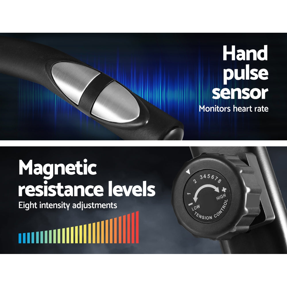 Get an effective workout in the comfort of your home while watching TV or listening to your favourite music. Our Everfit Recumbent Exercise Bike is just perfect to have all these at once. Designed for people who prefer a low or non-impact exercise regimen, our recumbent bike provides adequate exercise for the body without causing undue stress and strains on your joints and back. The relaxed seating position actually allows you to balance your body weight better and get your legs and heart to work together in tandem for better blood flow. The LCD display also helps to track parameters easily to let you monitor your health while exercising. The bike itself is constructed of an industrial-strength power-coated steel frame for durability and rust resistance. With up to eight resistance levels, the bike can be adjusted for the desired exercising intensity to suit your workout. Plus, the magnetic flywheel is smooth and runs almost friction-free. Other features include an adjustable seat length, wide and comfortable seat and non-slip protective feet. Not least, the recumbent bike is also easy to transport with two handy wheels for hassle-free moving.